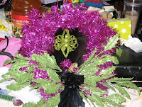 I have to admit that I did get the idea of using a tinsel wreath from Riz. She was the first to purchase one from Target and she did get Blackadder (the peacock) first as well. But I was the first of us to get the tinsel trees.